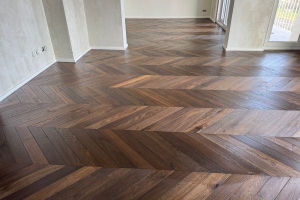 Nun wurde das Eichenparkett als Einzelstab im Fischgrätmuster verlegt. Abschließend erhielt der Boden eine Endbehandlung mit unserem robusten 2-Komponenten-Öl.